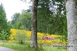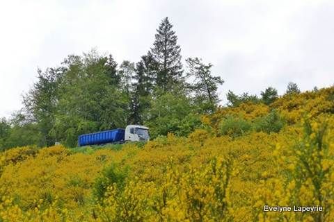Traversée de Gourdon-Murat: La RD32 en traverse du village s'est refait une beauté ! Un revêtement tout neuf au roulage parfait s'étend depuis "Chemin" en venant de Bugeat jusqu'à la sortie de village en direction de Lestards ou Treignac. La satisfaction des riverains s'est vite manifestée . Il faut dire que les équipes d'Eurovia, du Département et les prestataires partenaires ont plié l'affaire avec brio en 2 jours chrono et sans aucun accroc. Bravo! Quand c'est bien, il faut le dire aussi. Alors un grand merci au Conseil Départemental de la Corrèze et à tous les initiateurs de cette démarche...Je ne résiste pas au plaisir de vous mettre quelques images du résultat, parsemées du ballet des camions transportant l'enrobé, passant dans les genêts . Vous ne pourrez que constater qu'il y en a un bleu, un blanc et un rouge . C'est un choix photographique et esthétique s'il y en avait eu un violet, c'eut été parfait, pour mettre en valeur cette mer jaune qui nous entoure à Gourdon..